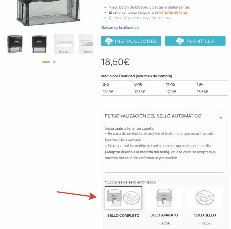 - Subir diseñocompleto: suba su diseño y nuestro servicio de personalización de selllos adaptará lo que suba al modelo que ha seleccionado.