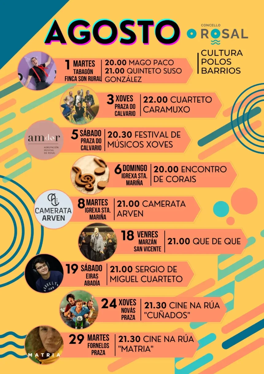 O concello do Rosal presenta unha programación cultural para o mes de agosto que ven chea de música, cinema e propostas para público familiar. As actividades realizaranse en diferentes espazos do municipio.