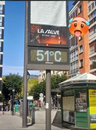 La foto que se adjunta en pleno centro de BILBAO refleja hasta qué punto el cambio climático es una realidad palpable. En la capital vizcaína y en plenas fiestas patronales, el termómetro llegó a 42 grados; algo subidos en el indicador termométrico radicado en pleno centro del BOTXO.