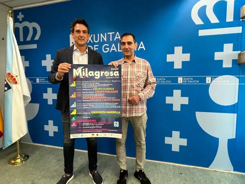 O delegado territorial da Xunta en Lugo, Javier Arias, acompañado polo presidente da asociación cultural e recreativa do gremio de hostaleiros de A Milagrosa, Pablo Pérez, presentaron o cartel das festas do barrio da Milagrosa nas que a Xunta volve colaborar sufragando o custe da publicación do libro conmemorativo desta celebración no que inclúe o programa de actividades.