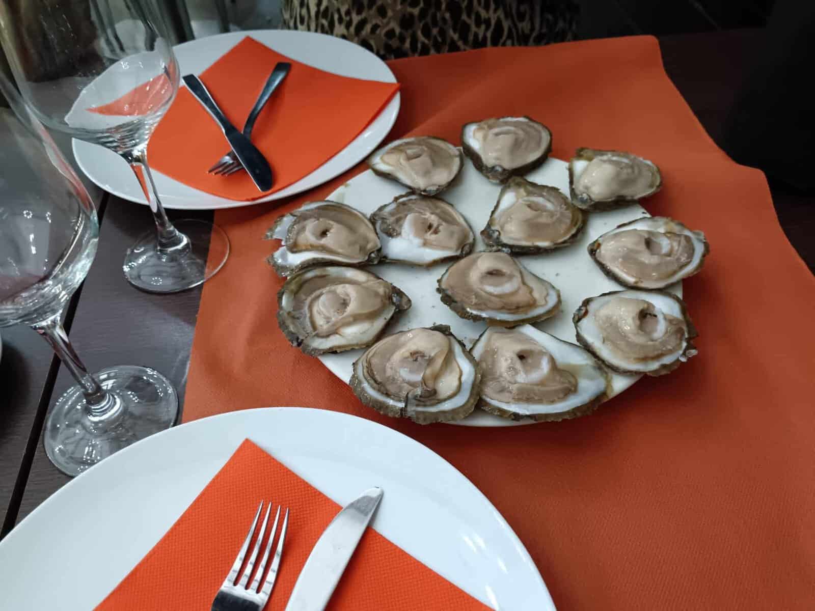 El precio de las ostras es variable, dependiendo de la temporada y de la oferta y la demanda, ahora está su viandas en el mejor momento, que es diciembre, enero y febrero, donde esta ostra salvaje alcanza el zénit de máxima calidad. Los precios oscilan entre 17€ la docena de la pequeña/mediana hasta los 25€ de la grande. Nosotros nos inclinamos por darnos el capricho con 24 ostras del tamaño grande.