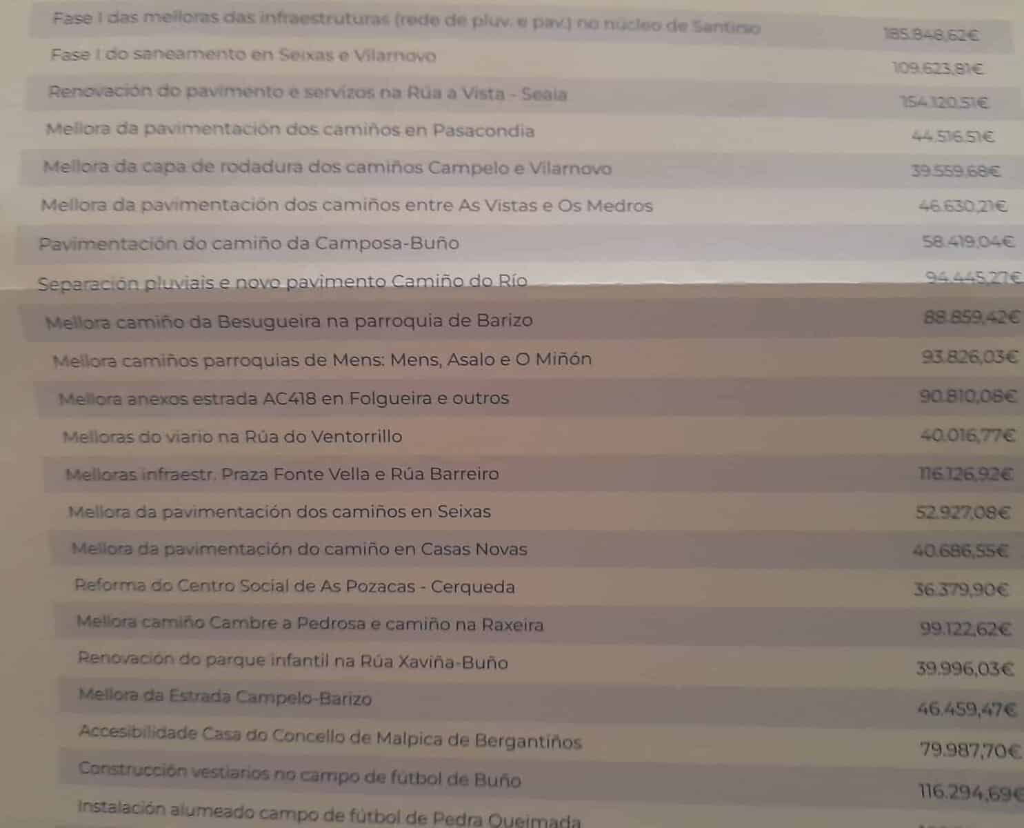 Ainda que moitos pensaron que se trataba dunha inocentada podemos asegurar que a información é fidedigna. Na meirande parte dos concellos costamorteños é a Xunta de Galicia e A Deputación as entidades que fan posible algunhas das obras básicas , cuarenta obras en Malpica, ainda que na foto aparece sempre o concejal de turno ou o propio alcalde. Chama a atención a desproporción económica entre obras financiadas e eses 200.000 euros só para gasto social, nada mais. As partidas para servizos básicos e gasto social son menores que o gasto en obras varias. As oposicións permanecen en absoluto silencio e só o PSOE de Malpica aparece como única oposición queixándose do despilfarro do Consistorio dos aforros que existían que se esfumaron nesta anterior lexislatura e lamentan os préstamos que xa se solicitaron deixando en números rojos as cuentas municipais. O Concello gasta todo no propio Concello e esquence as necesidades básicas das parroquias, especialmente, xa que seguen sen servizos moi necesarios, como por exemplo: depuradoras, beirarúas decentes, alcantarillado , pistas sen baches e unha longa lista de deixadeces. E a casa segue sen barrer.