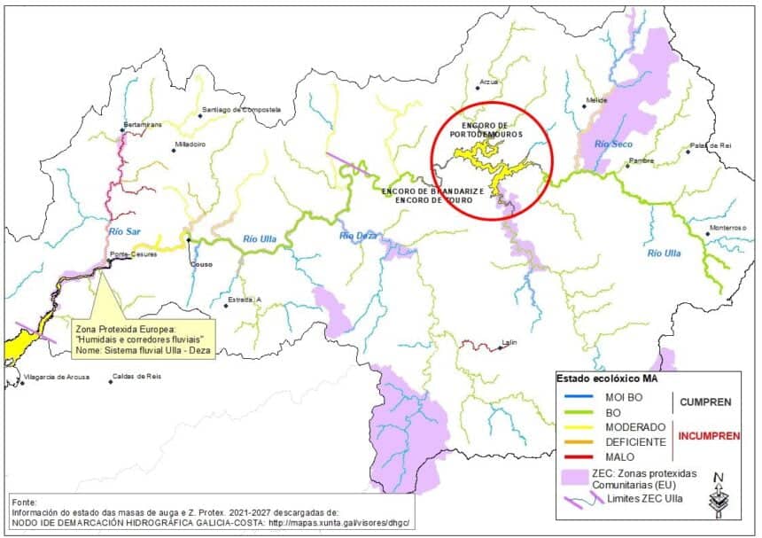 O encoro de Portodemouros, pretendido subministrador de auga para ALTRI é unha masa de auga que incumpre o potencial bó estado (estado ecolóxico moderado), contrariamente ao requirido polo PHG-C para o actual ciclo de plan¡nificación (2021-2027). De feito a principal presión que impide a consecución deste obxectivo é precisamente a contaminación orgánica causada polas verteduras.