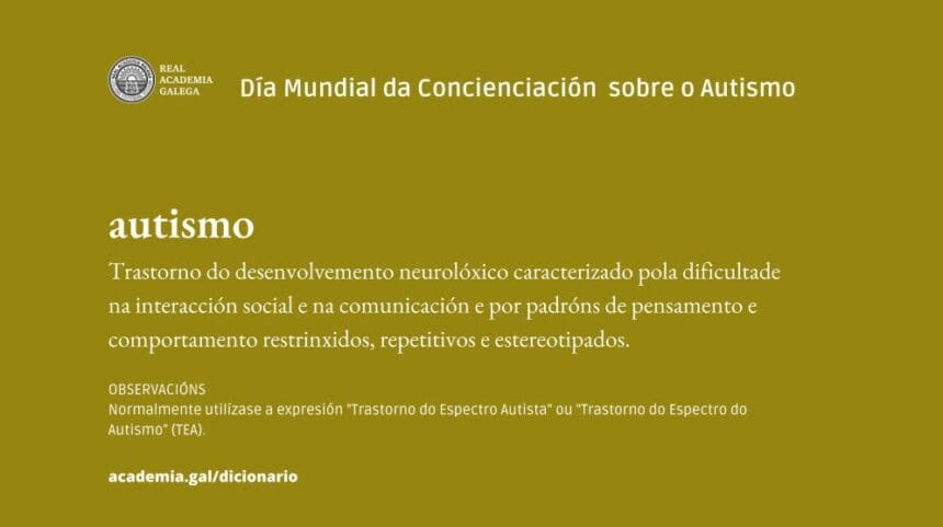 A Real Academia Galega modificou no seu dicionario en liña, nas vésperas do Día Mundial da Concienciación sobre o Autismo -que se celebra mañá, 2 de abril-, a definición deste trastorno do desenvolvemento neurolóxico. A nova redacción acordada polo Seminario de Lexicografía adáptase aos cambios producidos na súa descrición científica e mais na súa percepción social.