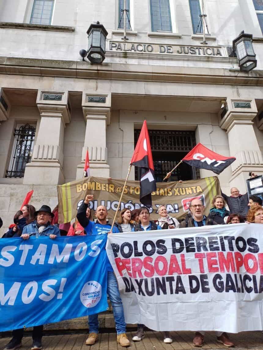 Onte, o persoal público temporal galego convocado pola CNT protestou ás portas do Tribunal Superior de Xustiza de Galicia en A Coruña para reclamar a fixeza dos seus postos de traballo.