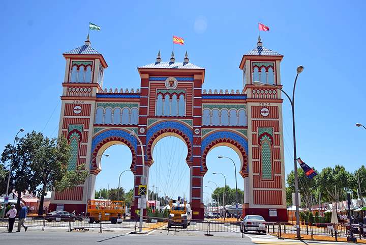 Este año, la emblemática portada rinde homenaje al Museo de Artes y Costumbres Populares de Sevilla. Su construcción e instalación es un puzle gigante de entre 3.000 y 4.000 piezas, y supone una obra de ingeniería por su carácter efímero y sus dimensiones, con una altura de 45 metros, equivalente a un edificio de quince plantas, y un grosor de siete metros. La «ciudad efímera», como se denominan a las quince calles, contó con 1.053 casetas. De todas ellas, 15 son públicas, mientras que el resto son emplazamientos privados donde solo se permite el acceso a los socios.