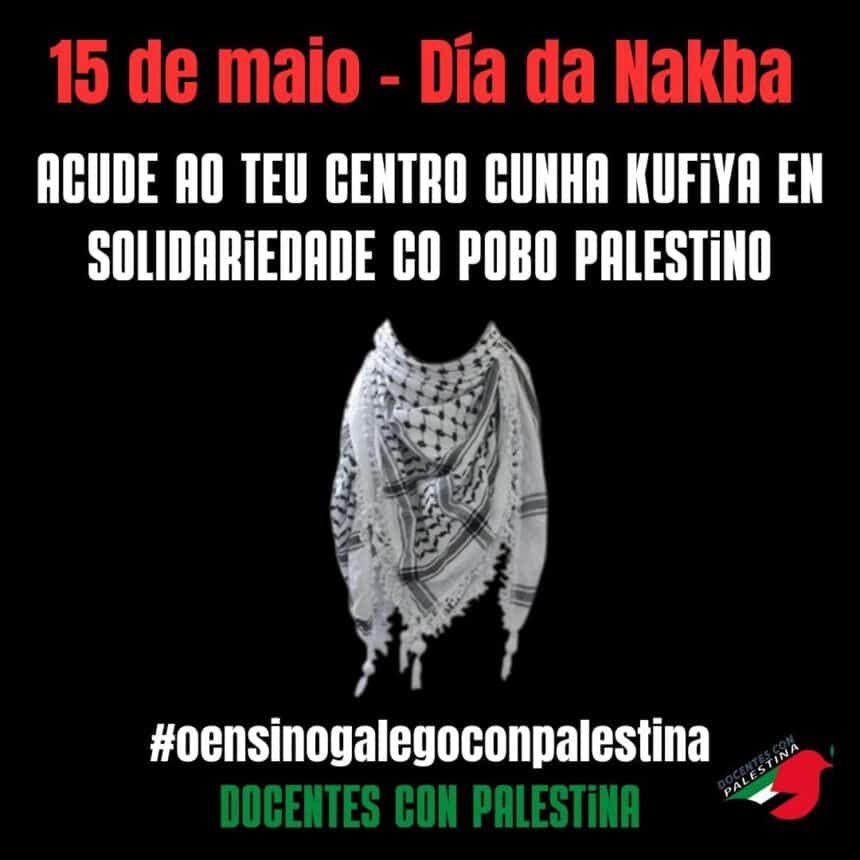 E porque non comezou o 7 de outubro, Docentes con Palestina convida a todos os membros da comunidade educativa a facer un exercicio de memoria histórica e conmemorar a Nakba acudindo o vindeiro 15 de maio aos centros educativos coa kufiya (pano típico da vestimenta da rexión que se leva no pescozo). De cara a lle dar repercusión á acción sacaranse fotografías e difundiranse despois nas redes sociais co cancelo #oensinogalegoconpalestina. En sinal de condena das atrocidades do Estado de Israel, en sinal de solidariedade co pobo irmán de Palestina, o 15 de maio leva unha kufiya.
