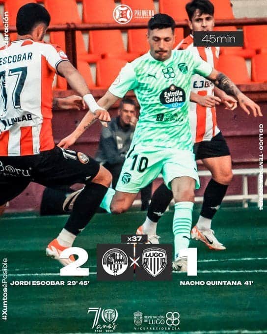 Jordi Escobar que fue el autor del doblete local, inauguró el marcador al filo de la primera media hora y pasados dos minutos del tiempo reglamentario de la primera parte, si bien antes había empatado Nacho Quintana para el equipo lucense, cuando faltaban tres minutos para que se llegase al intermedio, aunque luego el colegiado lo prolongó en tres minutos.