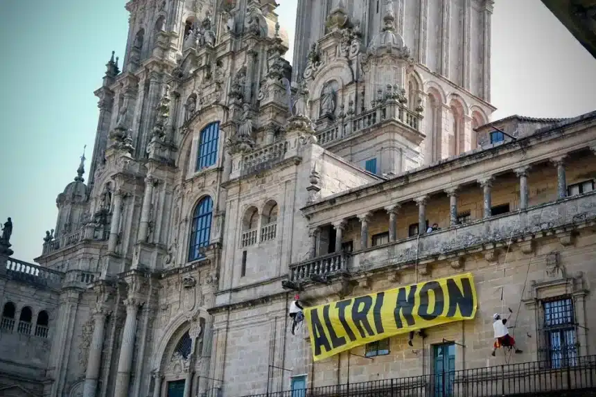 Co lema «ALTRI NON», escaladores de Greenpeace despregaron unha pancarta na balconada do museo da catedral de Santiago, fronte á sede da Presidencia da Xunta (Pazo de Raxoi), para pedir que se descarte o proxecto de construción da macrocelulosa que a multinacional Altri quere levar a cabo en Palas de Rei (Lugo). A acción foi apoiada tamén desde a praza do Obradoiro por activistas de Ecoloxistas en Acción.