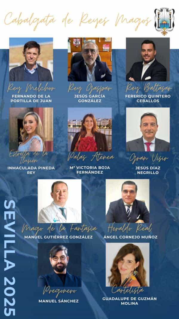 El cinco de enero esta responsabilidad recaerá sobre el jefe de Cirugía del Hospital Virgen del Rocío, Fernando de la Portilla, que representará al Rey Melchor; el empresario, fundador y director de la empresa de transporte y logística Gar Cía, Jesús García que será el Rey Gaspar; y sobre el periodista y empresario, director de Mediaset Deportes España Federico Quintero que encarnará al último de los reyes, Baltasar. Junto a ellos, la Estrella de la Ilusión, Inmaculada Pineda, directora financiera y de recursos humanos en la empresa familiar el Horno La Parra ; la diosa Palas Atenea, encarnada por Mª Victoria Boja directora gerente de una de las múltiples sucursales sevillanas de la empresa de logística y mensajería GLS; el Gran Visir será el empresario Jesús Díaz, director de operaciones del circuito internacional A1 Padel; para el Mago de la Fantasía contamos con la participación en el Cortejo del doctor especialista en Urología Manuel Gutiérrez. Por otro lado, el día 4 de enero el Heraldo Real será Ángel Cornejo, colaborador del Ateneo dedicado a la atención a la ciudadanía en el Hospital Universitario Virgen del Rocío; el presentador, humorista, actor, escritor, conferenciante y empresario Manuel «Manu» Sánchez será el encargado de pregonar la Fiesta Mayor; y Guadalupe de Guzmán, escultora de profesión, quien ilustró el cartel del evento.