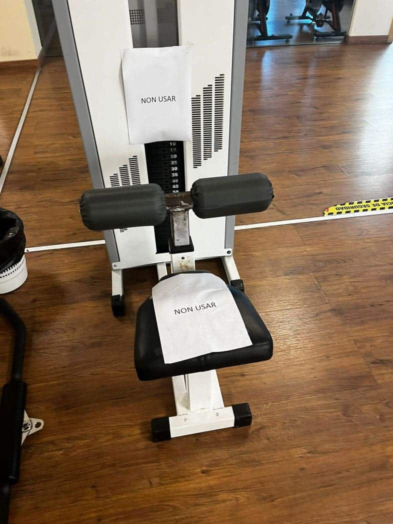 A cinta de correr non funciona; a metade das pesas de man están oxidadas a niveis que se dubida de que sexan sans; o único banco reclinable chocolea de tal xeito que o seu uso pode provocar algunha lesión; a prensa ten os soportes para os discos torTos e os seguros oxidados; a polea vertical está co cable roto e a horizontal a punto de romper (cando se sobe dos 60 Kg xa se escoita estalar); a máquina de hammer de ombreiro leva desnivelada desde hai anos e xa ten provocado algunha microlesión; a barra de dominadas está ostensiblemente torcida; hai espellos rotos que poden provocar accidentes; parte do chan está levantado e hai goteiras nalgunhas zonas. Este é o balance que os usuarios do ximnasio fan do seu estado.