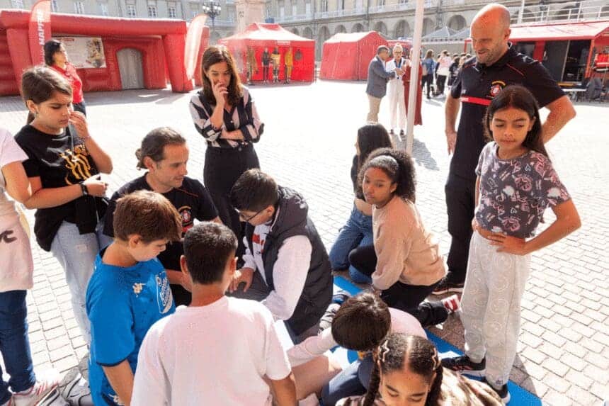 Rey puido supervisar unha das visitas escolares que estaba tendo lugar neste espazo, onde hai diferentes mostras e actividades para todos os públicos. O obxectivo desta iniciativa, que cumple a súa edición número 24 na cidade, é trasladarlle á cidadanía unha serie de coñecementos de autoprotección para que sexan capaces de identificar os riscos que se poden presentar no contorno máis inmediato, como é o fogar, a escola ou o centro de traballo. As persoas que participen adquirirán unha serie de coñecementos necesarios para poder actuar en diferentes situacións de risco.