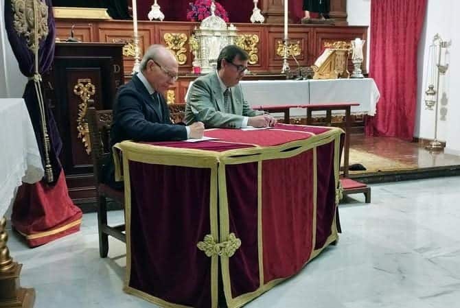 En un emotivo acto celebrado el pasado viernes en la capilla del Rosario se formalizó la firma de un convenio de colaboración y especial vinculación entre la centenaria cofradía sevillana de Las Aguas y el Ateneo Social y Castrense de Sevilla, que firmaron su hermano mayor, Narciso Cordero y el presidente del ateneo, Martín de Miguel, y que contó con la asistencia del Cónsul Honorario de México en Sevilla, Eduardo González Biedma.