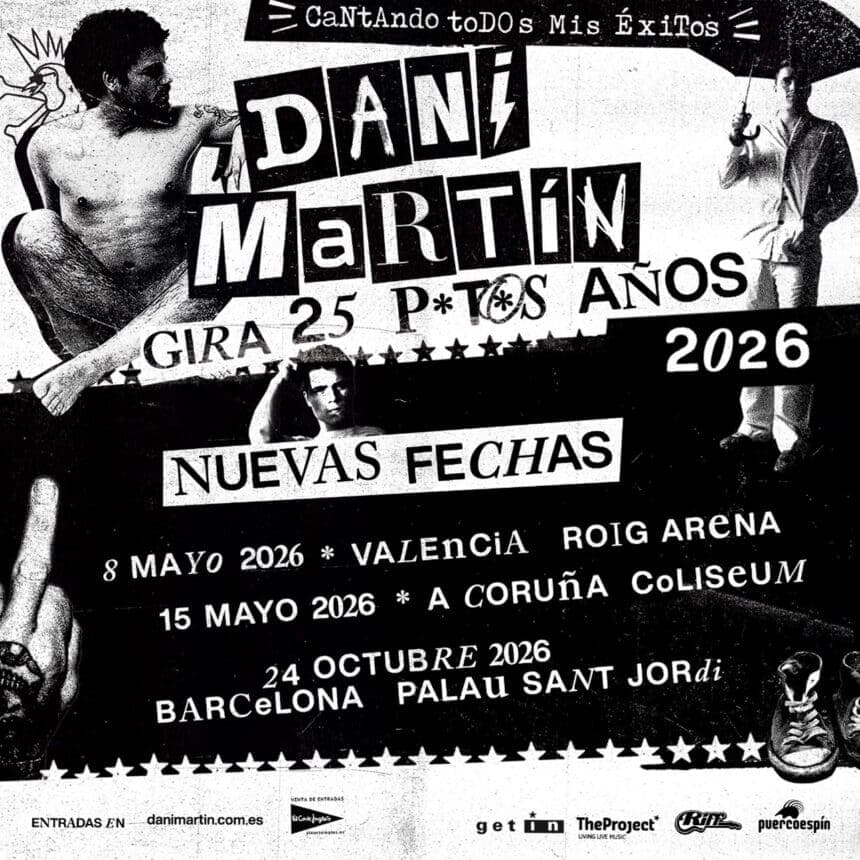 Dani Martín sigue incorporando fechas a su ‘Gira 25 p*t*s años’ . A los diez conciertos con ENTRADAS AGOTADAS en el WiZink Center de Madrid y a las 16 ciudades anunciadas recientemente para el año 2026, se suman ahora tres nuevas citas en VALENCIA, A CORUÑA y BARCELONA. En el caso de A Coruña, además, esta segunda fecha llega tras colgar el cartel de “sold out” en la primera.