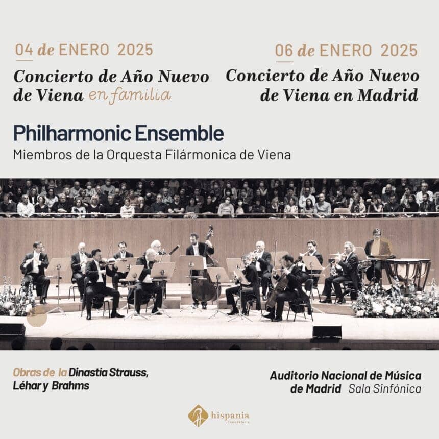 Philharmonic Ensemble se enorgullece de dar la bienvenida al 2025 en el Auditorio Nacional de Madrid. Compuesto por miembros destacados de la Orquesta Filarmónica de Viena, este conjunto trae, por tercera vez y como ya es tradición, el prestigioso Concierto de Año Nuevo de Viena a la capital española, apenas unos días después de su mundialmente conocido concierto en la Musikverein, retransmitido por televisión a más de 90 países. La singularidad de estos conciertos reside en la meticulosa interpretación y selección de obras que conforman el programa, ofreciendo a la audiencia una experiencia musical única e inolvidable.
