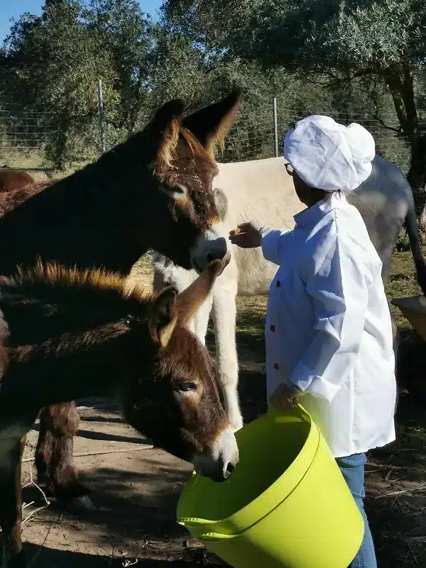 Ataviada con su uniforme de Chef profesional, Cristina y sus colaboradores van coordinando la confección de cada uno de los 180 menús que mañana disfrutaran, como cada Nochebuena, los componentes de la unidad de burros de terapia, los gansos desbrozadores, la oveja “Maya” o la cabrita “Dora Exploradora”.