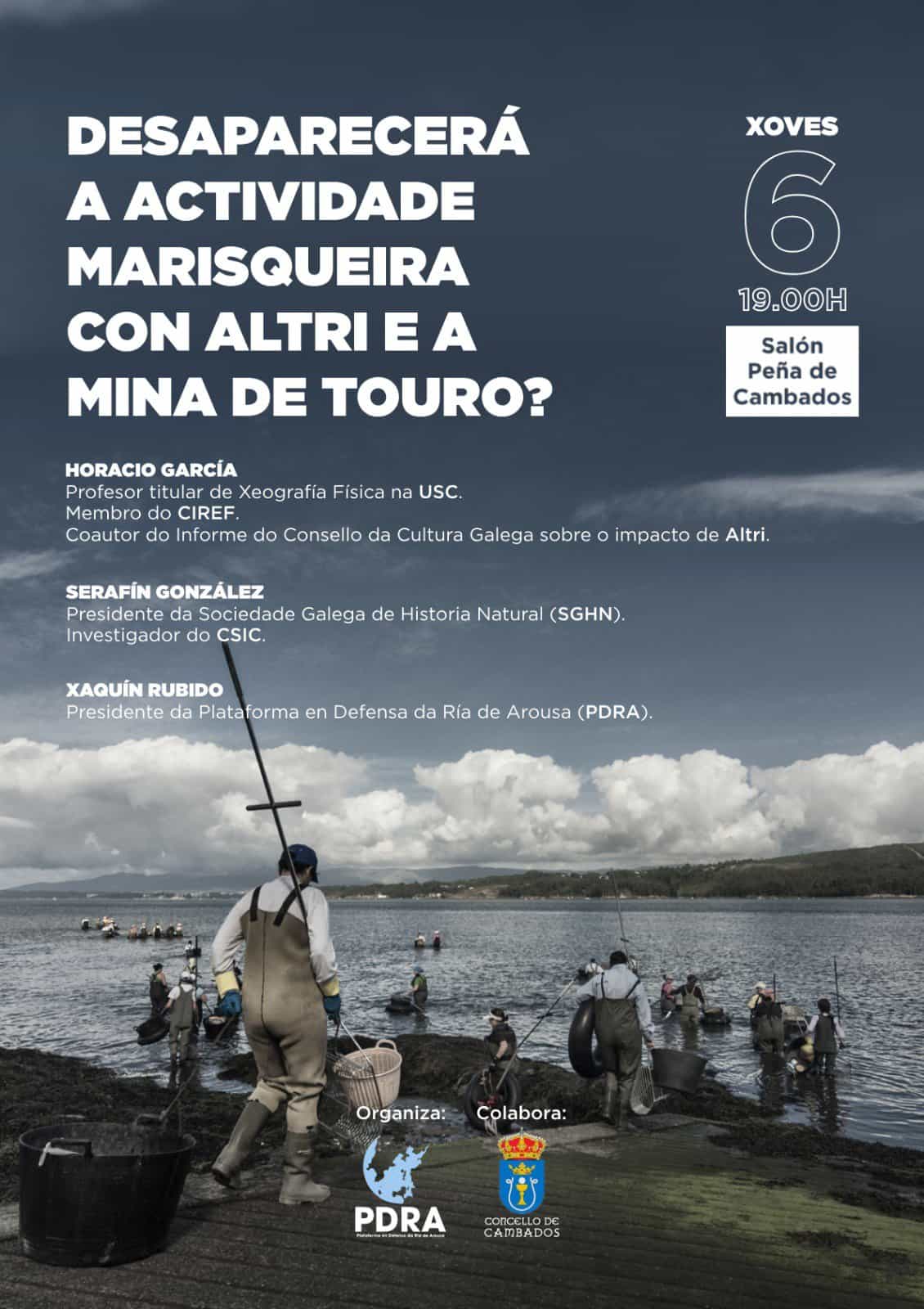 Neste sentido acordamos realizar un grande acto informativo sobre o impacto destes dous proxectos sobre a actividade marisqueira que se vai realizar o vindeiro xoves, 6 de marzo, ás 19:00h, no Salón Peña de Cambados, en colaboración co concello de Cambados. Neste acto falarán Horacio García, Profesor Titular de Xeografía Física da USC, membro do CIREF e coautor do Informe do CCG sobre o impacto de Altri, Serafín González, Pdte da SGHN e investigados do CSIC e Xaquin Rubido, Pdte da PDRA. Ademais colocaránse pancartas nos consistorios en colaboración con varios concellos da banda sur da Ría (Illa de Arousa, Catoira,…).