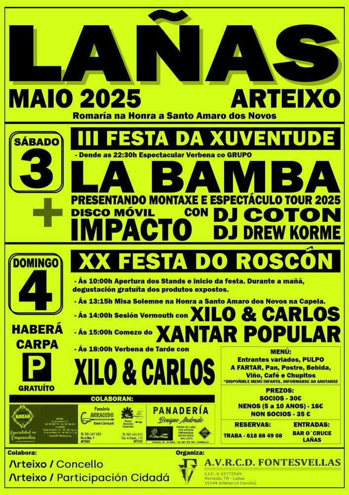 El 3 de mayo comenzarán las celebraciones con la III Festa da Xuventude, en la que habrá verbena a cargo del Grupo La Bamba (que presentará en Lañas su nuevo montaje y su espectáculo para la gira 2025) y de la Disco Móvil Impacto con DJ Cotón y DJ Drew Korme.