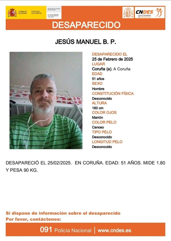 La Asociación SOS Desaparecidos ha emitido una alerta urgente para dar con el paradero de Jesús Manuel, un hombre de 51 años desaparecido el 25 de febrero de 2025 en A Coruña. Jesús Manuel mide 1,80 metros, tiene complexión normal, pelo canoso y ojos marrones.