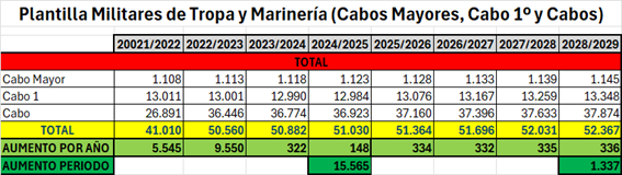 El Boletín de Defensa ha publicado la Orden Ministerial que establece las nuevas plantillas de militares de tropa y marinería (cabos mayores, cabo 1º y cabos) para el período 2025-2029. En uno de sus anexos se detalla la plantilla correspondiente al personal con una relación de carácter permanente.