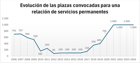 Del contenido del documento puede deducirse que, en el futuro próximo, el número de plazas destinadas a acceder a esta relación de servicios podrá sufrir una disminución. Esto contrasta con las convocatorias realizadas entre 2021 y 2024, cuando se ofertaban alrededor de 1.000 plazas anuales. Esta reducción podría estar motivada por el convencimiento del Ministerio de Defensa de que las plantillas «permanentes» han alcanzado su máxima cobertura.