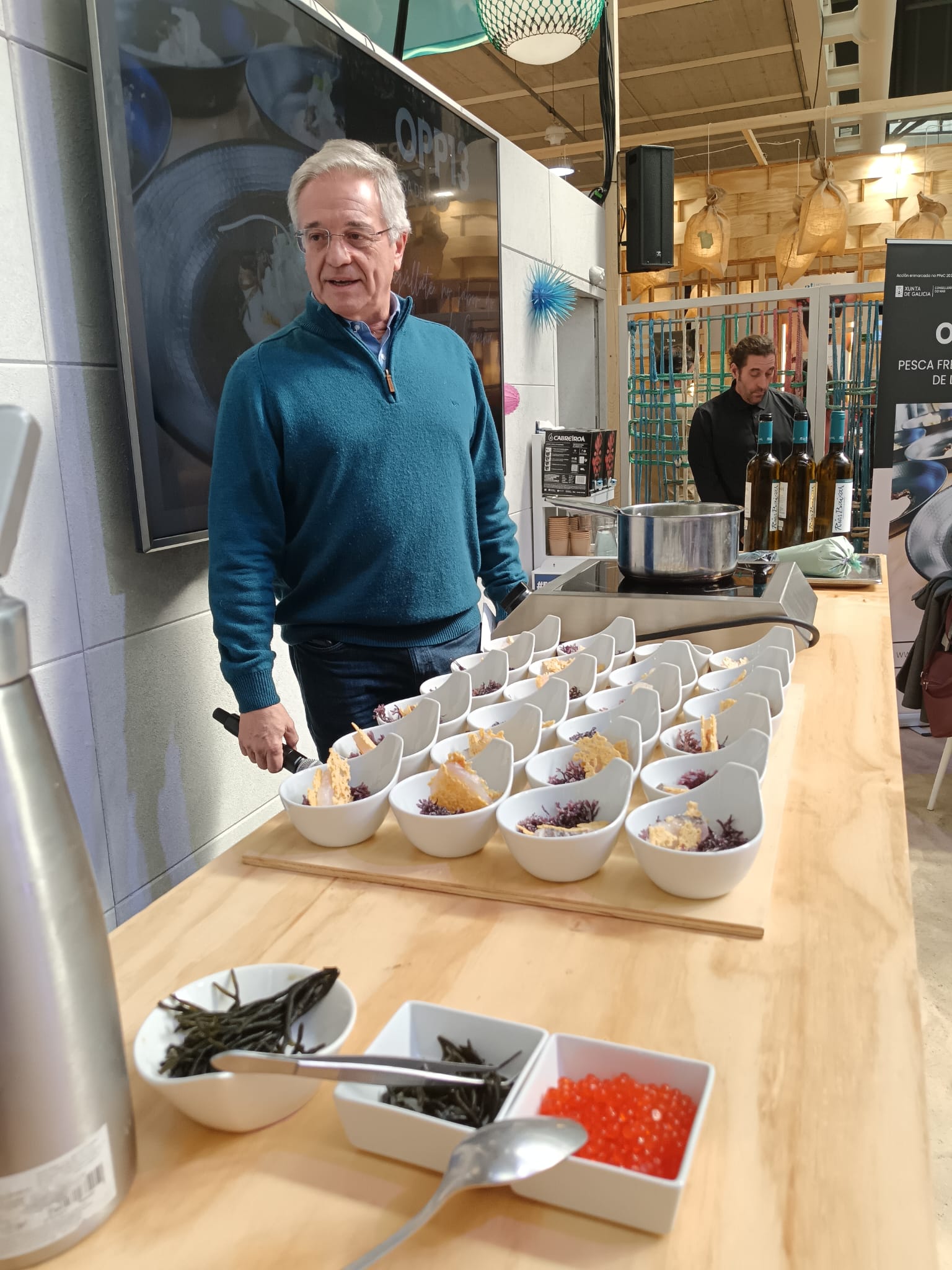 Llegó el día final de esta magna exposición, que abarcó todo el recinto de Expocoruña, situado en la entrada a la ciudad, donde en otro momento fue vacunódromo y nave de venta de vehículos, etc, pero que estos días se convirtió en el templo de la gastronomía de España y con algunas reminiscencias europeas. El último día, 24 de Marzo de 2025, nos anuncian que la periodicidad del Fórum será bianual, o sea, que hasta dentro de dos años (2027) no podremos disfrutar, ni tener, este emporio de la industria culinaria nuevamente en La Coruña. El martes, sin público, dedicado solamente a los profesionales del sector hemos estado en franca felicidad, pudiendo alternar en todos los espacios habilitados, para disfrutar tanto de la contemplación como de los experimentos culinarios, así como de la degustación de los productos excelentes que aquí se exhibieron durante estos días y alternar también en los lugares de ocio y de consumición para reponer las fuerzas, tanto los expositores como los profesionales que hemos asistido y que con el gasto de energía que supone estar al pie del cañón en estas celebraciones -cometido bien cansino- la recompensa es el disfrute de toda la excelencia de las maravillosas viandas que nos ofrecieron continuamente, minuto tras minuto, y de las cuales voy a destacar unas cuantas.