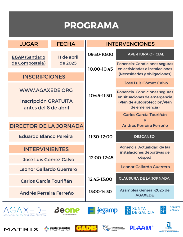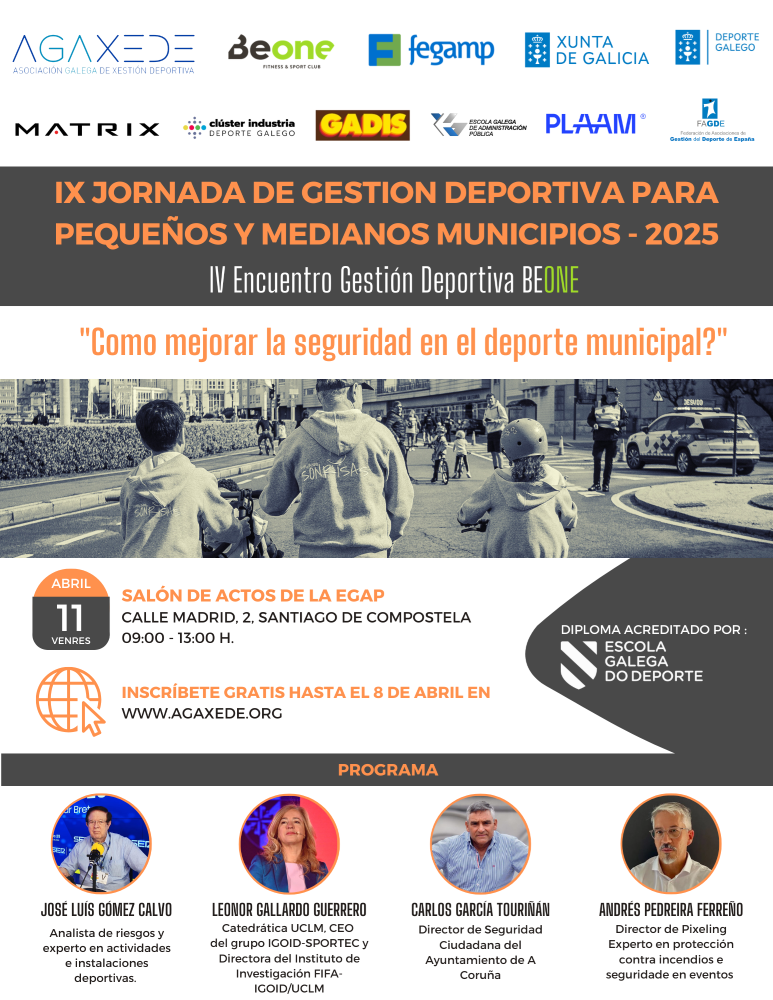 El viernes 11 de abril tendrá lugar la IX Jornada de Gestión Deportiva para Pequeños y Medianos Municipios en la Escuela Gallega de Administración Pública (Santiago de Compostela), organizada por AGAXEDE y la Federación Galega de Municipios e Provincias (FEGAMP), con la colaboración de la Secretaría Xeral para o Deporte de la Xunta de Galicia, Federación de Asociaciones de Gestión del Deporte de España (FAGDE) y la Escuela Gallega de la Administración Pública.