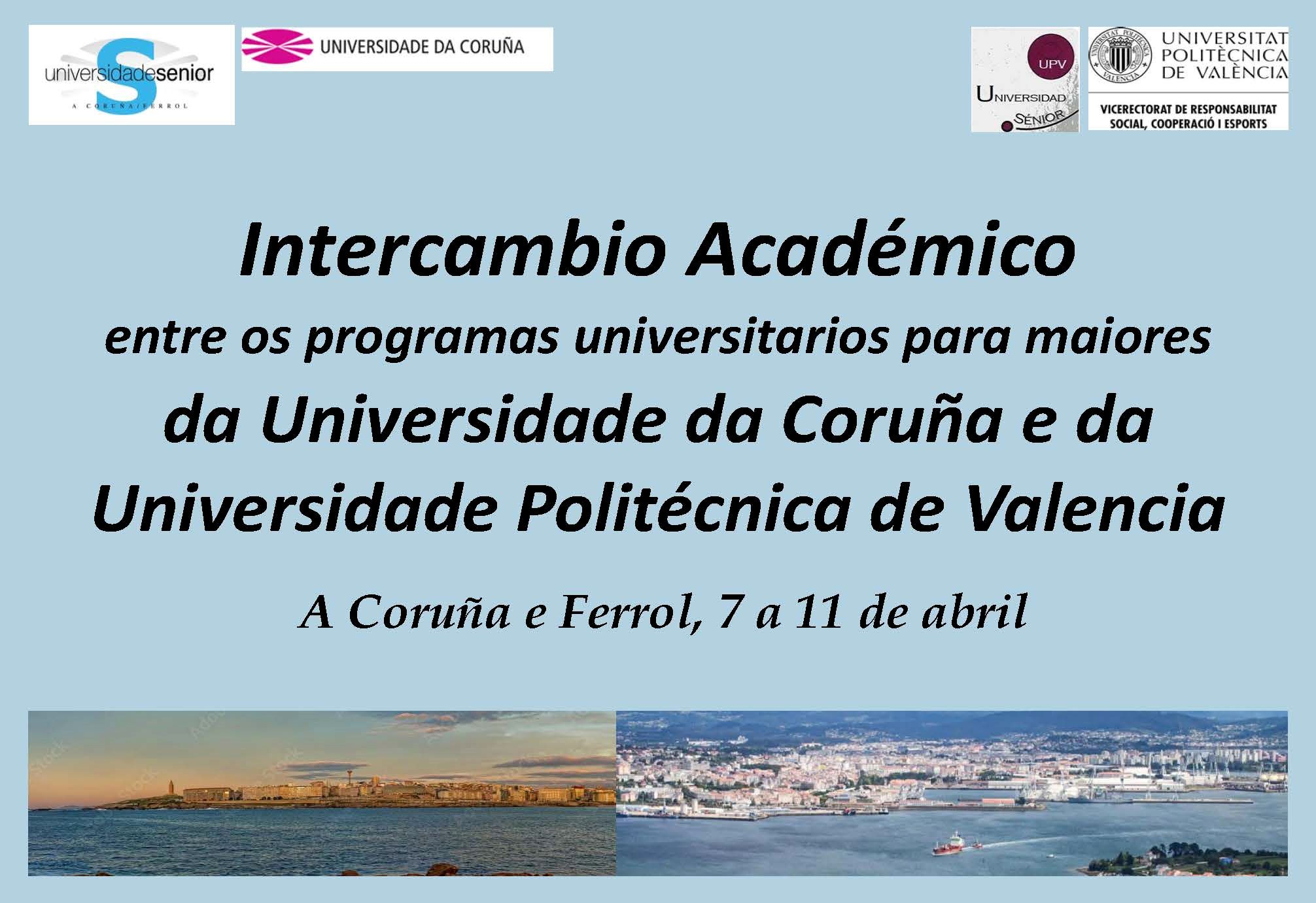 A Universidade Sénior da Universidade da Coruña acollerá, entre o 7 e o 11 de abril de 2025, unha nova edición do Intercambio Académico co programa universitario para maiores da Universitat Politècnica de València (UPV). Durante cinco días, os participantes compartirán actividades académicas, sociais e culturais nos campus da Coruña e Ferrol.
