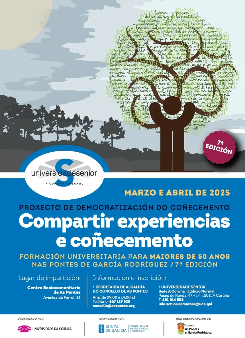 O vindeiro xoves, 24 de abril, ás 19:00 horas, terá lugar nas instalacións da Universidade Sénior en Normal, o acto de clausura da 7ª edición do Programa de Democratización do Coñecemento, impulsado pola Universidade Sénior da Universidade da Coruña para as persoas maiores de 50 anos das Pontes, no que participaron máis de 50 persoas.