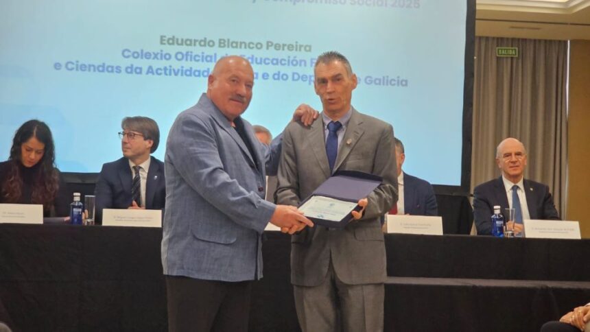 El sábado, día 10, se celebró en el Hotel Puerta del Camino de Santiago de Compostela, la ceremonia de entrega de los Premios de la Unión Profesional de Galicia integrada por 46 Colegios profesionales que representa a más de 90.000 profesionales de Galicia. Eduardo Blanco que es Licenciado en E.F. y Doctor en Derecho, junto a profesionales de otras áreas de conocimiento (medicina, fisioterapia, ingeniería, arquitectura, etc.), recogió el “Premio a la Excelencia y Compromiso Profesional 2025” otorgado por la Unión Profesional de Galicia, a propuesta del COLEF-Galicia.