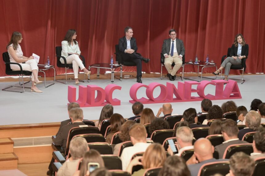 A xornada UDC Conecta tamén contou cunha mesa redonda na que participaron Alba Tuñas Cantorna, co-directora da Cátedra Resonac-UDC Sparking Truth; Francisco Javier Prego Martínez, responsable do departamento de I+D+i de Extracto; Rafael Morgade, director de Transformación Dixital e Industrial en Navantia Ría de Ferrol, Centro Mixto de Investigación UDC-Navantia (CEMI) -CITENI; e María José Mariño Fontenla, directora da área de Talento e Transferencia da Axencia Galega de Innovación da Xunta de Galicia.