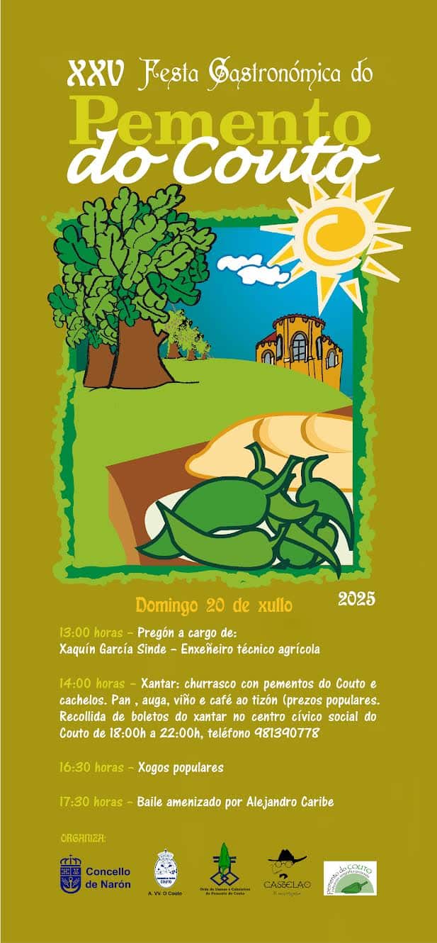 A festa gastronómica promocionará un ano máis o pemento do Couto, con Indicación Xeográfica Protexida dende o ano 2010. A programación deseñada para a ocasión comezará ás 13:00 horas, coa tradicional lectura do pregón no centro cívico social do Couto, unha tarefa que este ano se lleencomendou ao enxeñeiro técnico agrícola Xaquín García Sinde. O xantarpopular será a partir das 14:00 horas na carballeira do Couto, nas inmediaciónsdo centro cívico social da parroquia. Os comensais poderán degustar churrasco con pementos do Couto e cachelos, acompañados con pan, auga, viño e café ao tizón, a prezos populares. Os boletos do xantar poden adquirirse a partir deste xoves, día 10, a un prezo de 15 euros para adultos e 7 euros para menores de 12 anos, no centro cívico social do Couto, de 18:00 a 22:00 horas, chamando ao teléfono 981 390 778. Ás 16:30 horas comezarán os xogospopulares e ás 17:30 dará comezo o baile, amenizado por Alejandro Caribe.