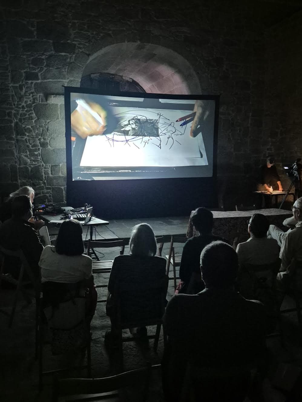 Tras la cita académica el dibujante Pablo Gallo y el músico Iago Alvite presentaron ante el público su performance inspirada en La lámpara maravillosa, en la que se juntó el espíritu de Valle-Inclán con la música y el dibujo.