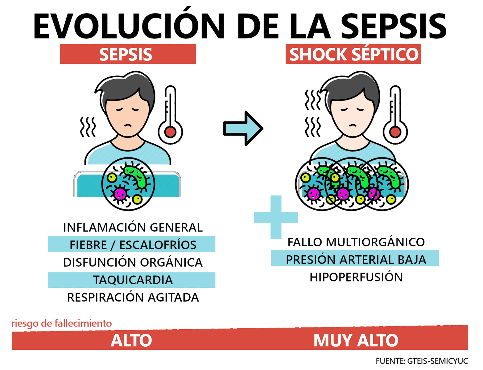 La mortalidad de la sepsis es consecuencia de una suma de factores: las características del paciente, las del microorganismo que provoca la infección, el estado de gravedad que presenta antes de ser atendido y la adecuación y precocidad del tratamiento que se reciba. La suma de todos ellos permite entender la fragilidad a la que se enfrenta el paciente.