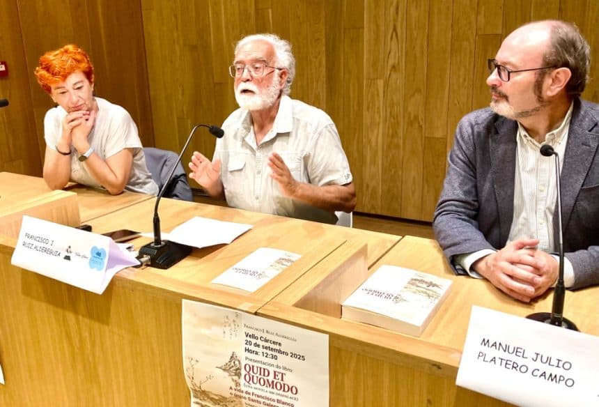 O escritor Francisco J. Ruiz de Aldereguía presentou o seu libro máis recente, Quid et quomodo, “unha novela sen desenlace”, centrada no santo galego Francisco Blanco, un rapaz de Tameirón, en Ourense, que, xesuíta primeiro, e franciscano despois, marchou ao Xapón a evanxelizar e alí atopou a morte, crucificado en 1597, aos 26 anos. A historia do santo é a guía que segue o autor para contar, noveladamente, unha historia moi descoñecida en Galicia, que é, en síntese, a competencia entre xesuítas e franciscanos por cómo evanxelizar esa parte do mundo que tiña unha cultura avanzada cando españois e portugueses chegaron alí. Unha historia que é parte da nosa propia historia.