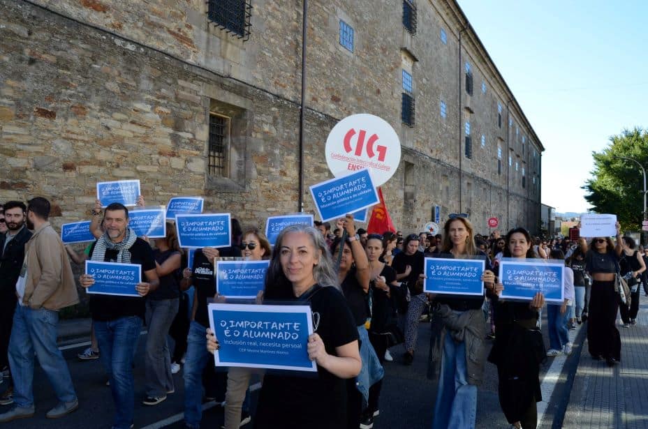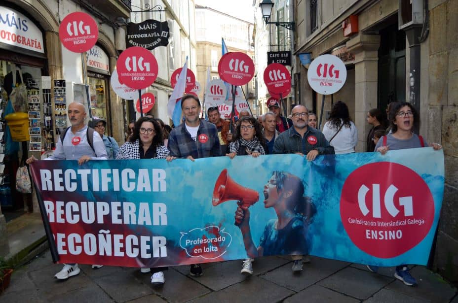 A protesta tamén puxo o foco na perda de dereitos laborais e no horario lectivo, que en Galicia segue sen recuperarse. O sindicato recalcou que, a pesar de que «os orzamentos da Consellaría falan claro», a Xunta mantén conxelado o número de docentes e non recupera o pagamento do verán para o persoal substituto, o que fomenta a precariedade.