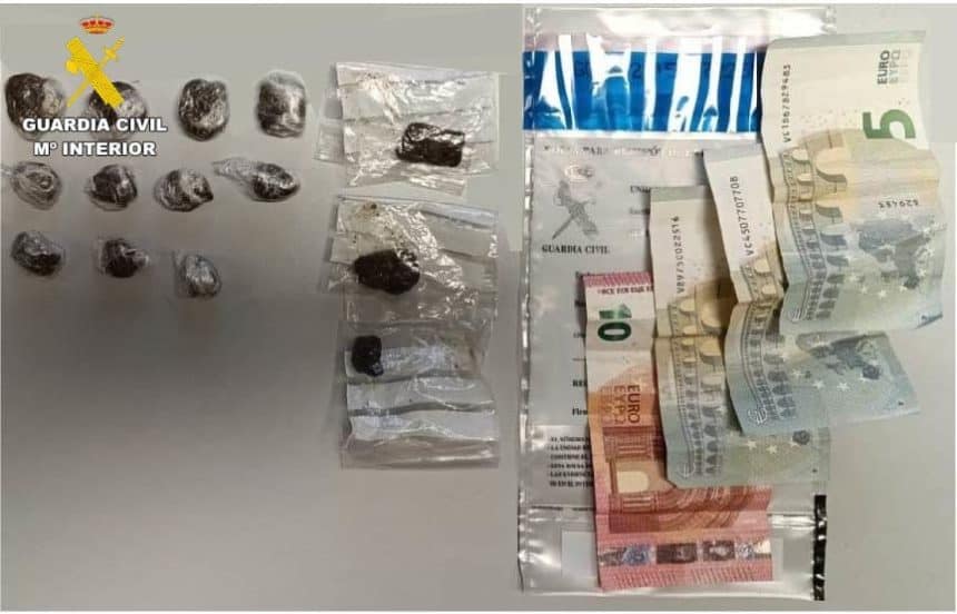 Los guardias civiles actuantes se aproximaron al grupo, apreciando un fuerte olor a hachís que emanaba del cigarrillo, motivo por el cual procedieron al registro de las pertenencias de los jóvenes, hallando ocultos entre la vestimenta de uno de ellos 14 trozos de una sustancia resinosa de color marrón, supuestamente hachís, envueltos individualmente en plástico, los cuales arrojaron un peso total de 31 gramos, 3 billetes de 5 euros y 1 billete de 10 euros.