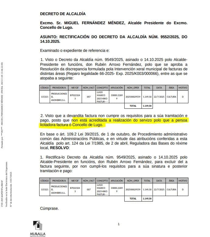 Agora xa pasamos unha liña vermella. Esta desconfianza vense de exteriorizar co decreto que acabamos de descubrir e que asinou onte o alcalde con respecto a unha factura do Lugo Máxico de 2025.