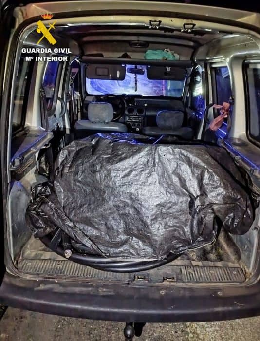 Ante las incongruencias de sus explicaciones, los guardias civiles procedieron al registro de la furgoneta, hallando en la parte trasera, oculto bajo un plástico de color negro, una importante cantidad de cable telefónico, distribuido en 3 rollos y diversas herramientas, entre ellas 2 cizallas.