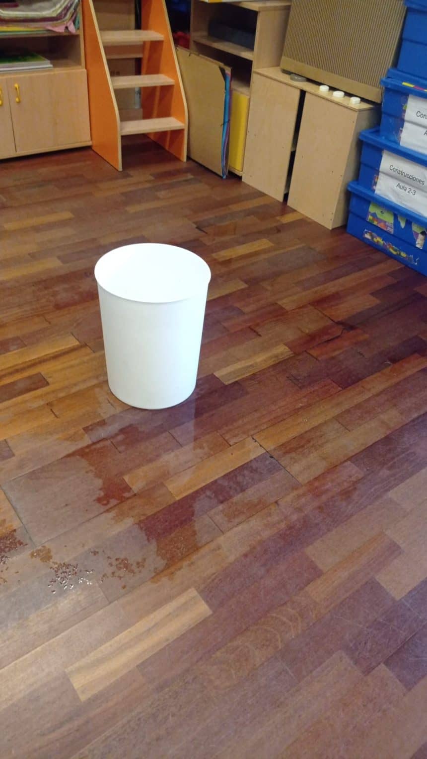 A entrada da escola é unha auténtica trampa e un foco de perigo. A auga das goteiras reborda e esténdese polo chan, que se converteu nunha perigosa pista de patinaxe. Familias, educadoras e crianzas deben sortear cubos de auga por todas partes para acceder ao centro.