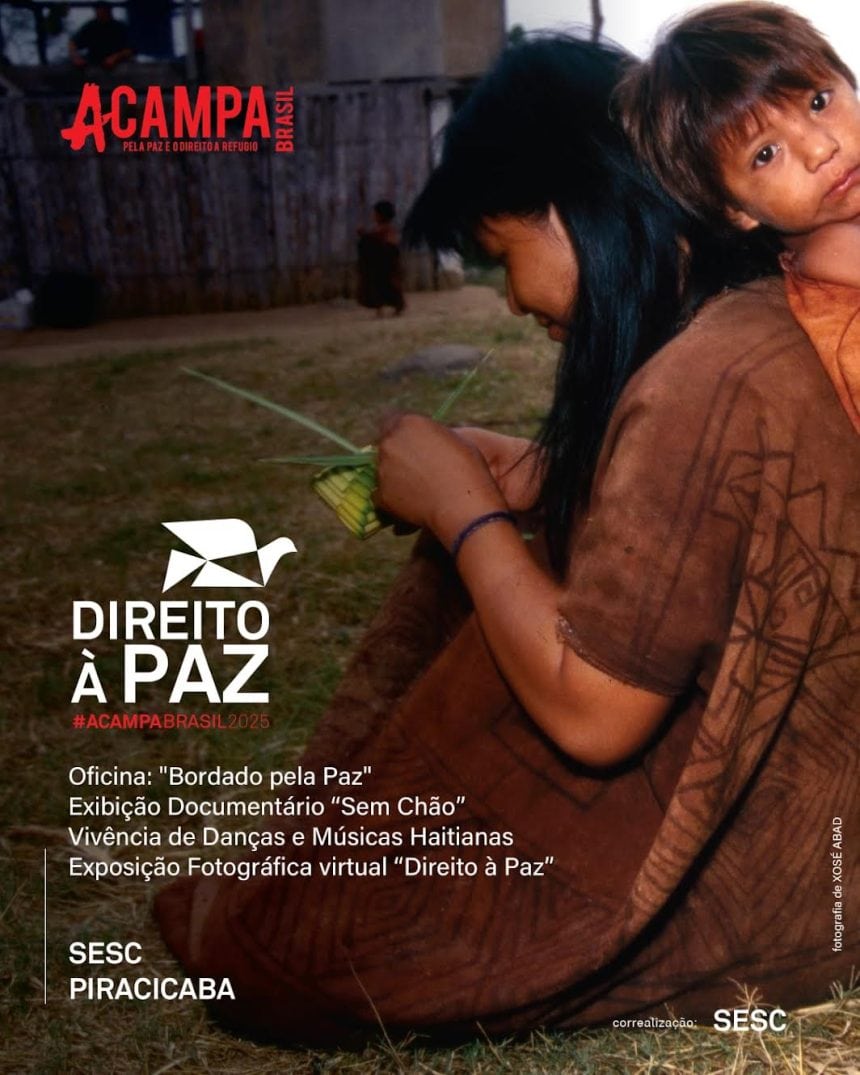 Acampa por la Paz y el Derecho a Refugio Brasil inaugurará su Encuentro Internacional 2025 el próximo 2 de diciembre con el Derecho a la Paz como eje central de su programación. Las actividades diseñadas por el equipo que lidera la profesora universitaria Célia Regina Rossi, coordinadora de la red en Brasil, se desarrollarán en el SESC de Piracicaba, entidad patrocinadora y sede de las distintas propuestas programadas: muestras fotográficas, un taller de bordado por la paz para niños y jóvenes, danza internacional y la exhibición del documental ganador del Oscar 2025 “No other land” con un posterior debate.