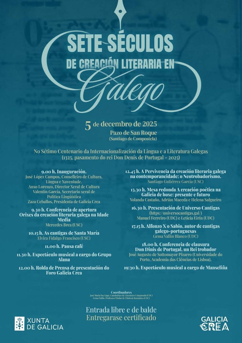 O vindeiro venres terá lugar a cita cultural arredor das primeiras creacións literarias en galego, que se remontan a finais do século XII. As cantigas galego-portuguesas estenderanse por toda a Península nos dous séculos seguintes, acadando o seu máximo esplendor na época do monarca e trobador don Dinis de Portugal, que foi quen de converter unha lingua esencialmente literaria, o romance galego-portugués, na lingua oficial do Reino de Portugal. O ano do pasamento de don Dinis de Portugal, 1325, hai sete séculos, marca a efeméride da consolidación da creación poética en lingua galega.