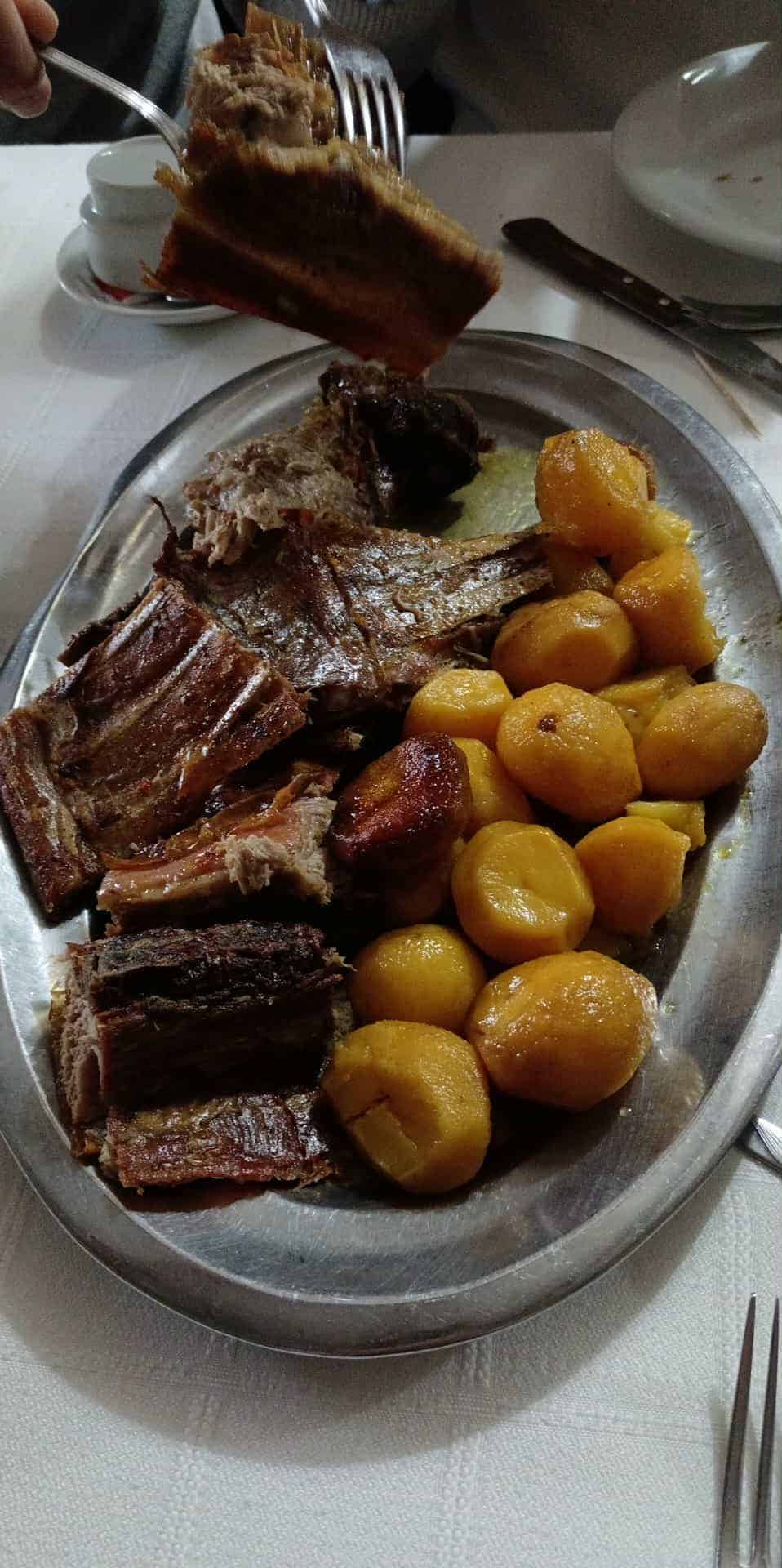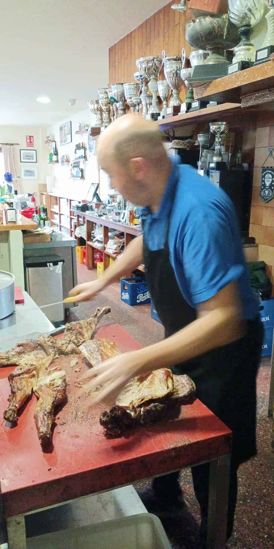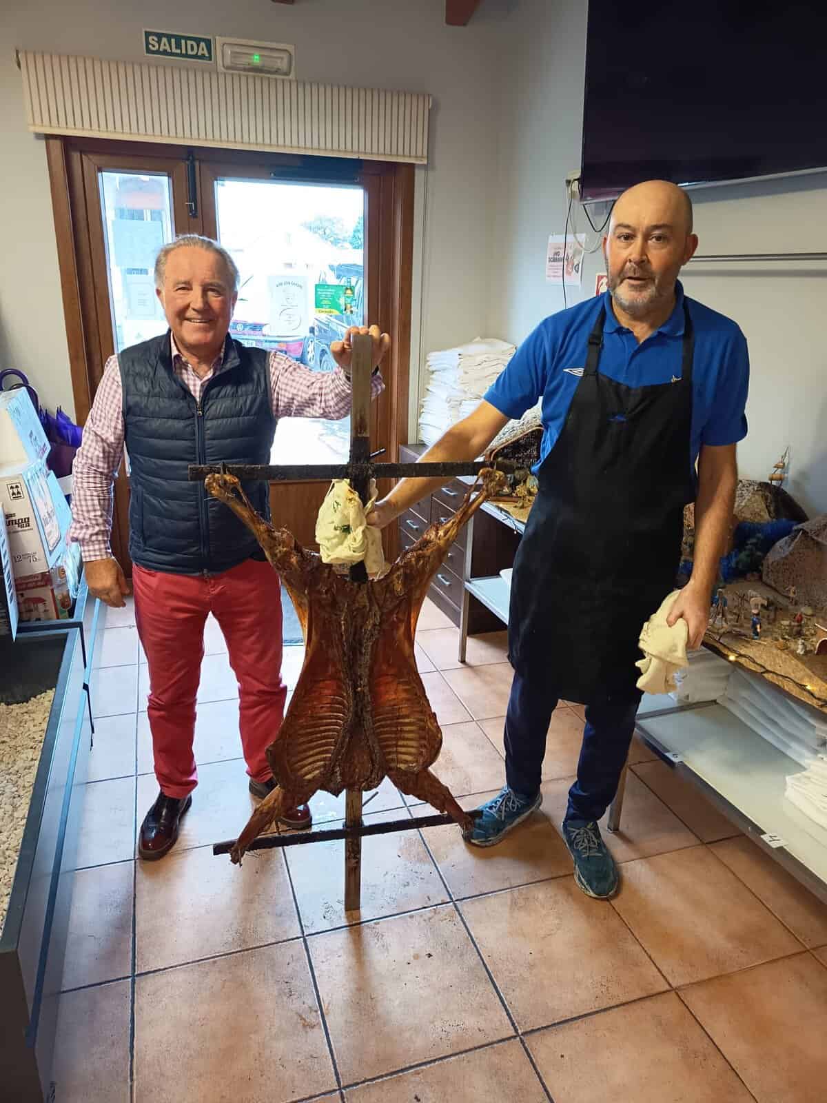 El menú especial para la celebración consistió en cuatro carneros asados al espeto de los cuales comimos tres y uno nos fue troceado y regalado en bandejas individuales para cada uno de los artilleros existentes a la comida de confraternidad por parte de Doña Pilar, alma mater de la Parrillada Carlos.