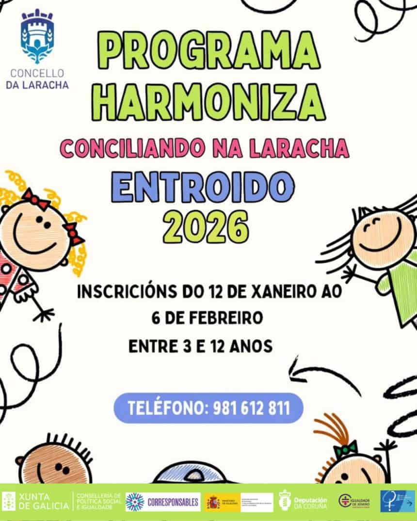 O Concello abrirá o luns a inscrición para o servizo de apoio á conciliación da vida persoal, laboral e familiar que se oferta a través do Programa Harmoniza: Conciliando na Laracha nas Festas de Entroido, o luns 16 e o mércores 18 de febreiro -o Martes de Entroido non se oferta ao ser festivo local na Laracha-.