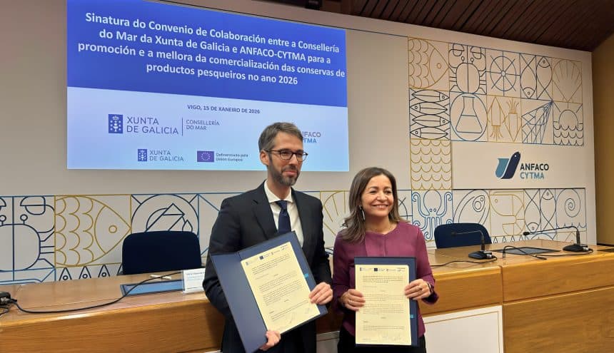ANFACO-CYTMA y la Consellería do Mar de la Xunta de Galicia han firmado un convenio de colaboración para el desarrollo de un amplio programa de actividades a lo largo de 2026, orientado a fomentar el consumo, la comercialización y el posicionamiento de las conservas y productos transformados de pescado y marisco, tanto en el mercado nacional como internacional.