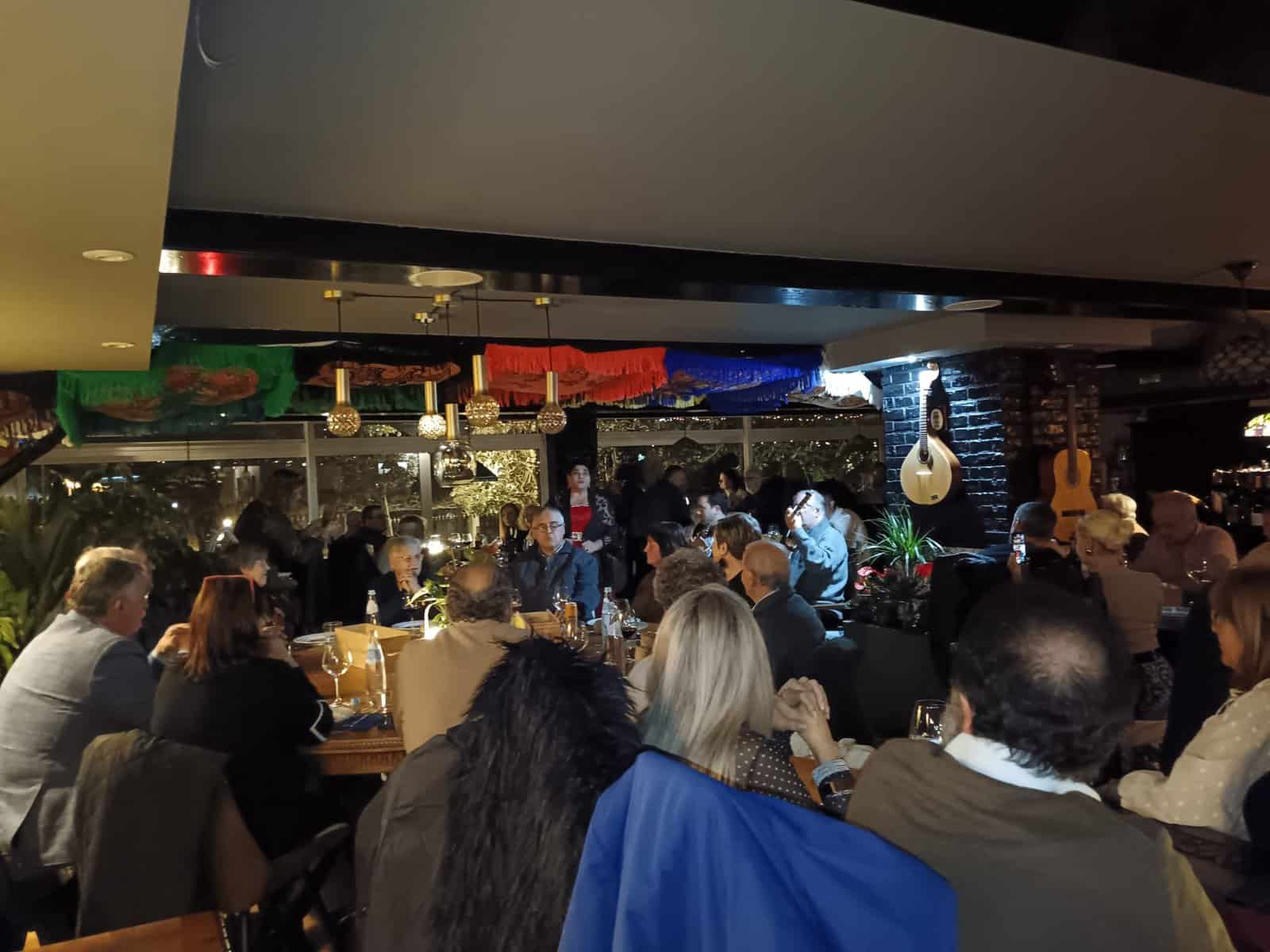 El generoso reparto del famosísimo vino portugués de Oporto animó a un mucho más las almas y los corazones de todos los que cenamos en maravillosa convivencia oyendo los famosos fados, declamados por María do Sameiro, vos femenina y por el fadista José Manuel acompañados a la guitarra de fado portugués por Rafael Eusébio y guitarra universal de José Saraiva.