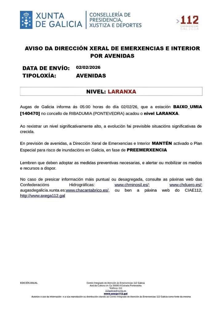 Ante las previsiones meteorológicas e hidrológicas recibidas, se informa a la población de la existencia de un riesgo elevado de inundaciones en la comarca, afectando especialmente a los cauces de los ríos Avia, Miño, Maquiáns y Outeiro. El episodio de lluvias persistentes comenzó anoche y se prevé que se mantenga durante toda la semana.