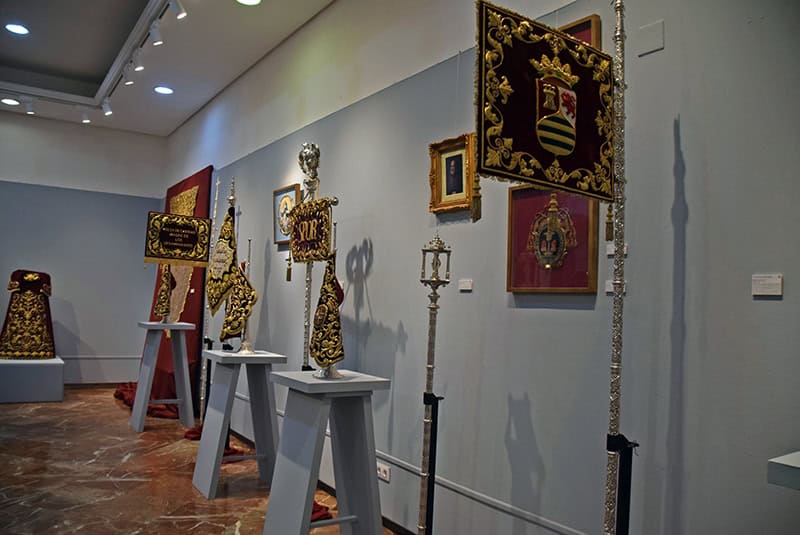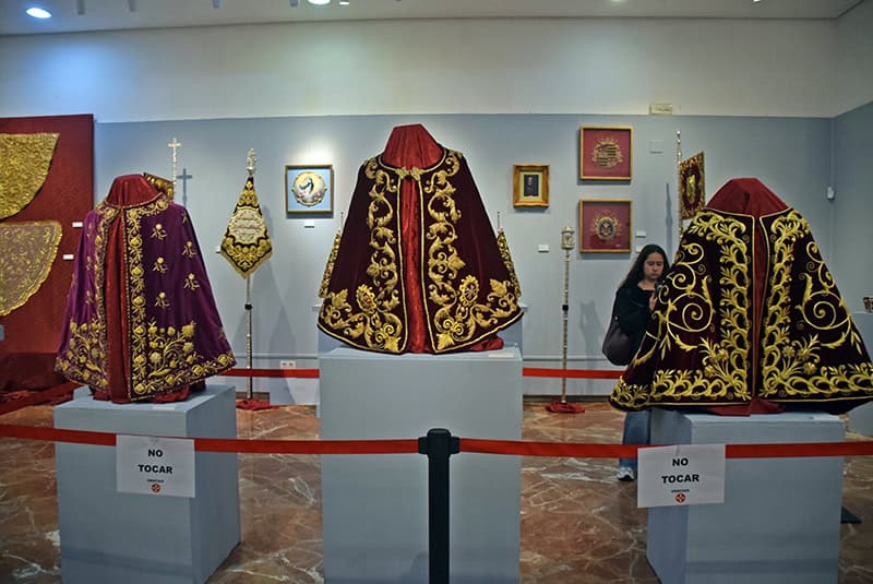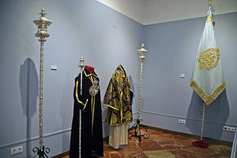 La siguiente zona expositiva reúne una selección representativa de los enseres que acompañan a la Hermandad en su estación de penitencia, con especial atención a los hábitos nazarenos utilizados históricamente. Se exhiben tanto la indumentaria primitiva —túnica color crema con capirote y capa azul celeste, aún vigente— como la túnica azul de cola adoptada durante los años de la posguerra, motivada por las dificultades económicas del momento. Esta última pervive simbólicamente en la actualidad a través de los manigueteros que acompañan a los pasos cada Martes Santo.