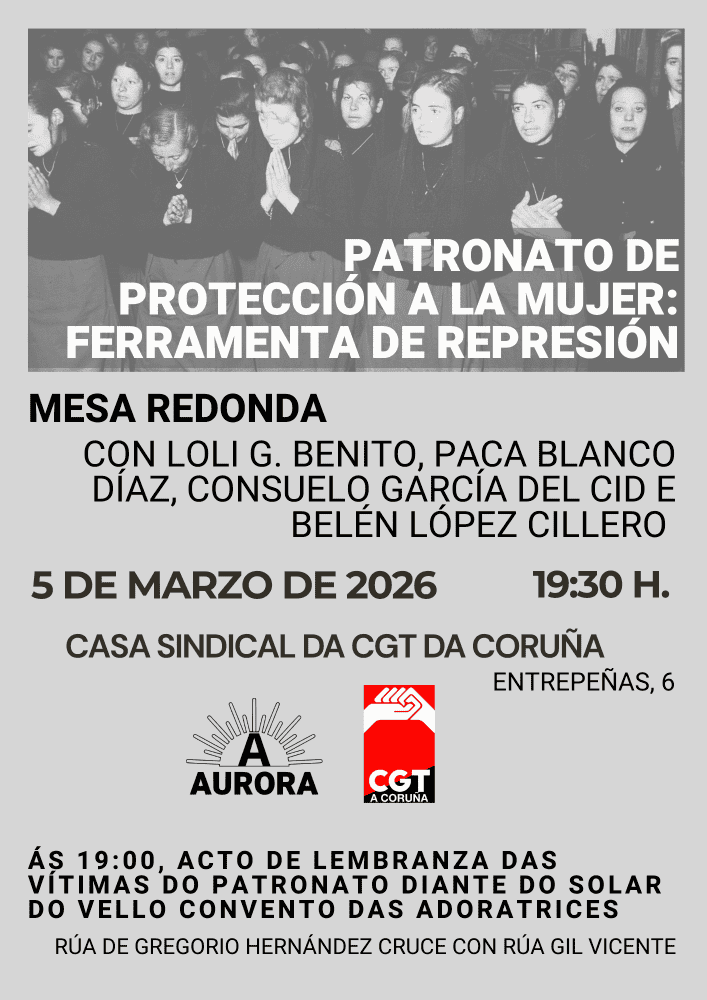 Co gallo das mobilizacións do 8M, a Confederación Xeral do Traballo (CGT) da Coruña, en colaboración co Ateneo Aurora, organiza unha xornada de homenaxe e denuncia este xoves, 5 de marzo. O acto busca dar voz ás nenas e mulleres que sufriron a represión desta institución franquista, que operou na cidade ata ben entrada a democracia.