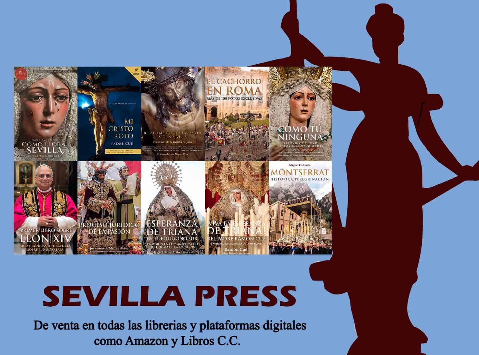 Se trata de un nuevo libro de la colección de Religión y Semana Santa de Sevilla de la editorial Sevilla Press, que comenzó con ‘Cómo llora Sevilla…’, del Padre Cué, y siguió con ‘Gran Poder de Sevilla: Crónica de la Santa Misión’, de varios periodistas y escritores sevillanos; ‘Mi Cristo Roto’, también del Padre Cué; ‘Cómo sigue llorando Sevilla…’, de Francisco Correal; ‘Trilogía Sevillana del Padre Cué’; ‘Teoría y Realidad de la Semana Santa de Sevilla’, de Antonio Núñez de Herrera, miembro de la Generación del 27 que relata la Semana Santa de la segunda república, “Magna de Sevilla 2024”; ‘Esperanza Macarena, Rosa de Oro’, del Doctor en Derecho Penal Juan Antonio Martos Núñez; ‘Así fue la Magna de Sevilla’; ‘Setefilla en la Magna de Sevilla’; ‘Relato médico de la Pasión, según Sevilla’ del doctor Fernando de la Portilla y siete médicos más; ‘El Cachorro en Roma’, ‘Esperanza Coronada de Málaga en Roma’; “!Viva la Esperanza de Triana! Del padre Ramón Cué, y “Proceso jurídico de la Pasión” también del Doctor en Derecho Penal Juan Antonio Martos Núñez, así como dos libros sobre el Papa León XIV: ‘Diez crónicas de urgencia sobre el nuevo Papa’ y ‘De mensajero peruano a Santo Padre’.
